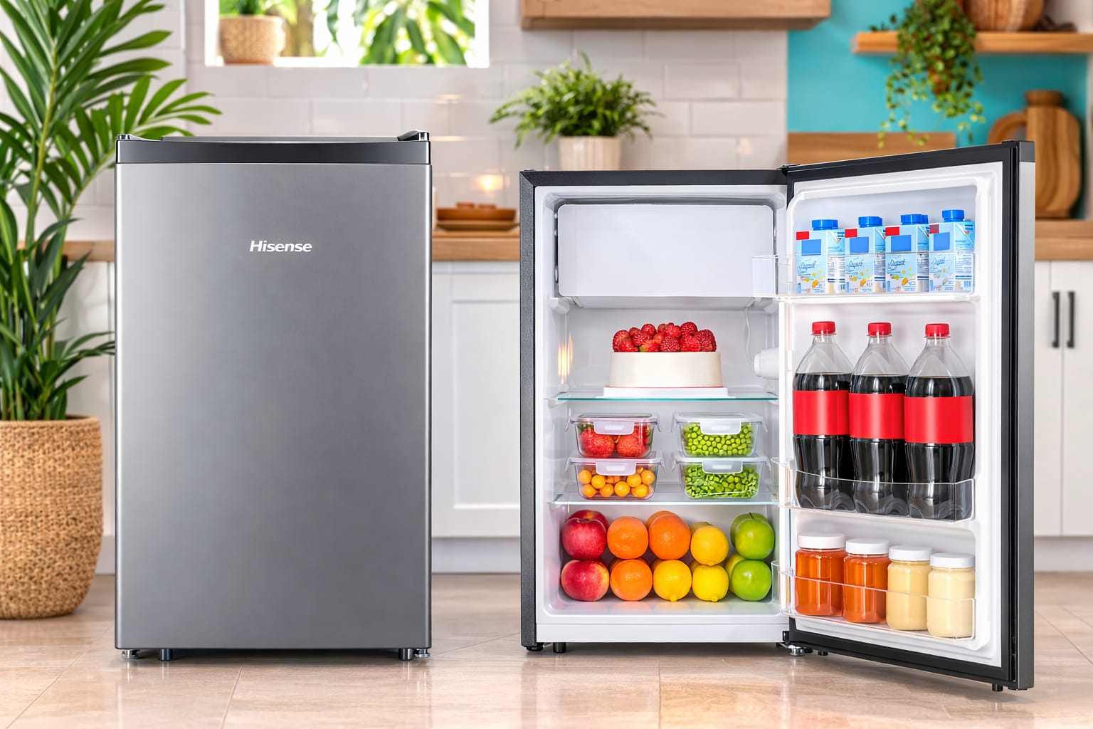The Hisense single door refrigerator with a capacity of 124.6 liters / 4.4 cu ft is suitable for small spaces that require functionality. Ideal for offices, studios, dorm rooms or as a side-by-side refrigerator, this compact model offers a well laid-out interior that maximizes storage with great efficiency. It features two glass shelves, a fruit and vegetable compartment, and back door storage spaces that allow for everything from large bottles to small containers to be stored in an organized manner. In addition, its built-in freezer with separate door allows you to store frequently used frozen items.